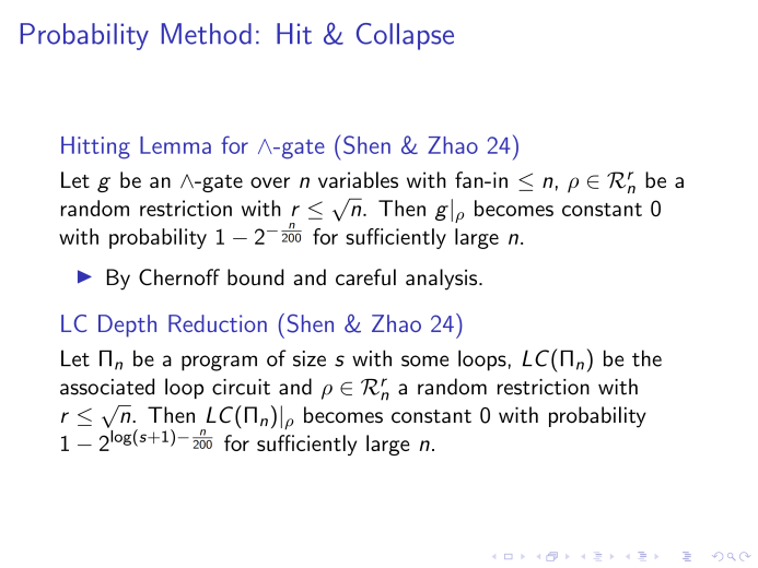 然而接下来面临的问题是,Håstad的方法只适用于多项式大小的深度固定的电路,面对很大的深度固定的电路时,需要寻找另外合适的Hit。受香农推导论证的启发,沈老师通过概率算法证明了合取门输入超过100个时也是容易消除的。具体理论如下图: