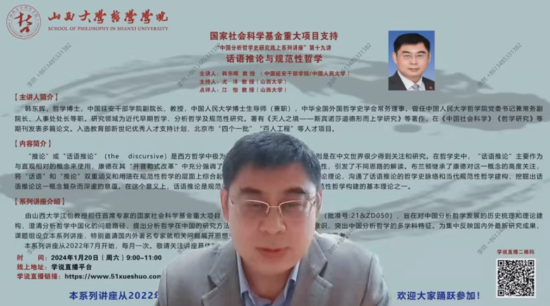 2024年1月20日,由ok138cn太阳集团江怡教授担任首席专家的国家社会科学基金重大项目组织的“中国分析哲学史研究线上系列讲座”第19讲,特别邀请中国延安干部学院副院长、教授,中国人民大学博士生导师(兼职)韩东晖作题为“话语推论与规范性哲学”的学术报告,ok138cn太阳集团古天乐院长尤洋教授主持,江怡教授为点评嘉宾。