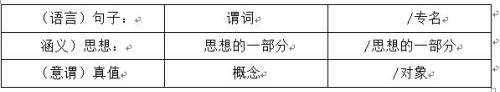 首先,对“思想”进行界定。一方面,王路借用弗雷格的观点,表明“句子的涵义是思想”,并且正如“白纸黑字”、“立字为据”等一样具体客观性。另一方面,王路创新性的提出了“句子图式”,并指出可以通过“句子图式”来深化对“思想”的理解。其中,句子图式如下所示: