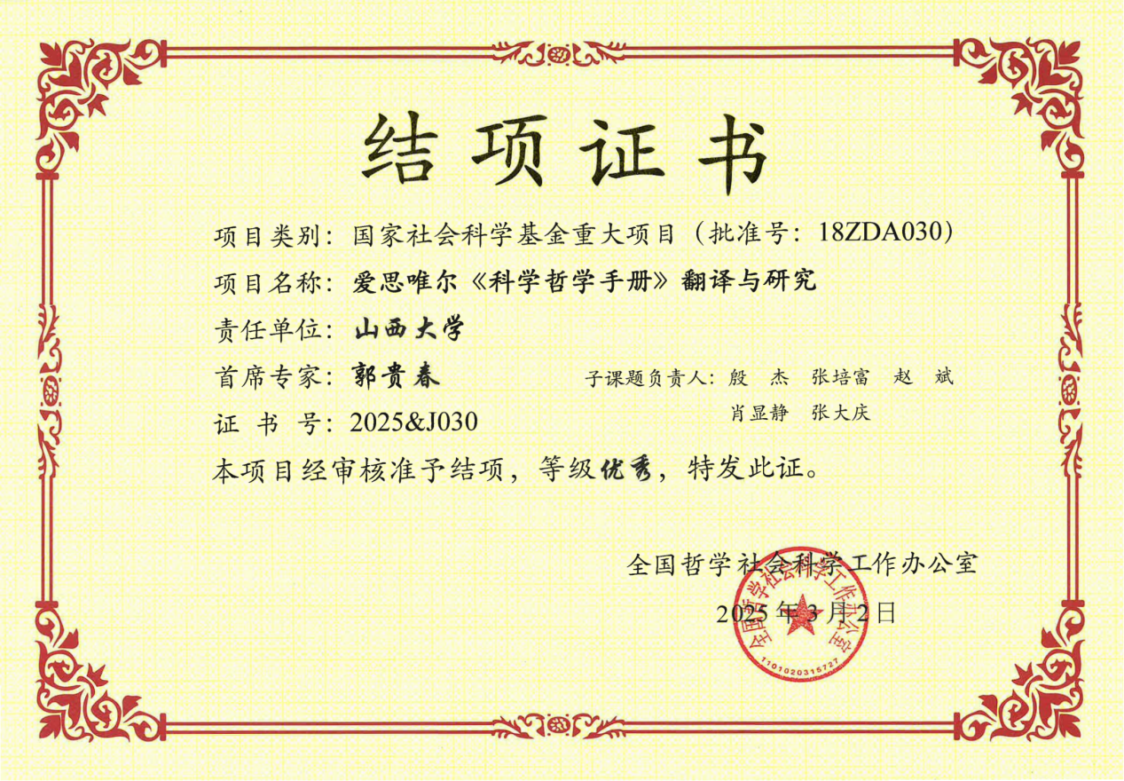 近日,由我校科学技术哲学研究中心郭贵春教授主持的国家社会科学基金重大项目“爱思唯尔《科学哲学手册》翻译与研究”(项目编号:18ZDA030)顺利通过全国哲学社会科学工作办公室结项验收,最终成果评定为“优秀”等级。